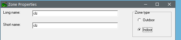 Start openzone.exe. On the top menu, select file, properties. Select indoor for zone type, and shortname/long name to clz for now. Click OK