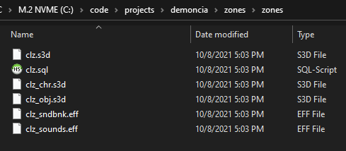 In your zones subdir you'll see a list of various files. For now, you are only interested in the s3d and eff files.