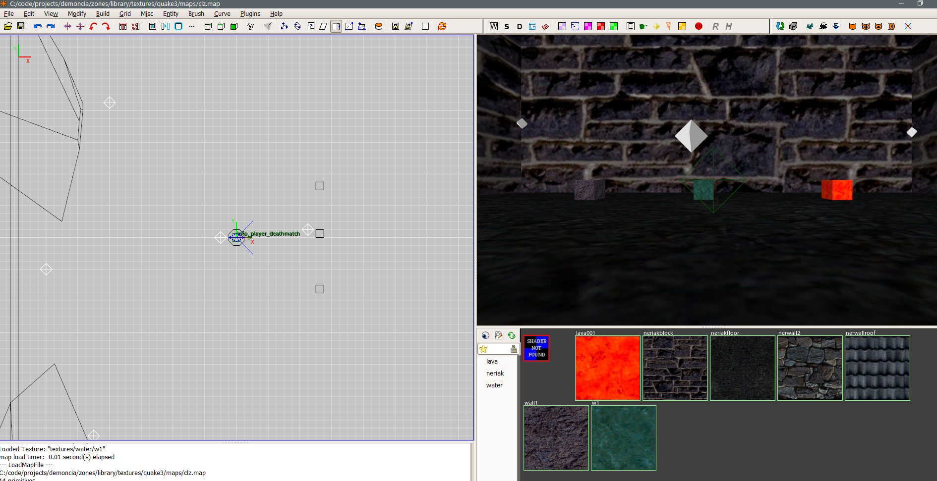 On the top menu, select file, import, Quake 3 Map... and browse for library/textures/quake3/maps/clz.bsp. You'll see a screenshot like below:
