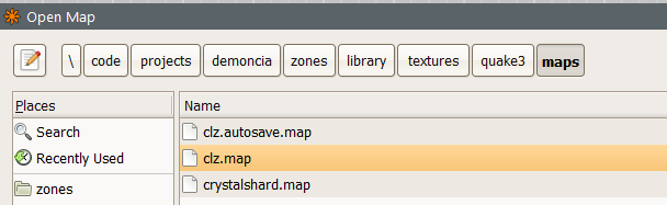 Click file, open. You should see my premade maps listed, like clz. Note the path, library/textures/quake3/maps of the dir you extracted radiant to. Click open