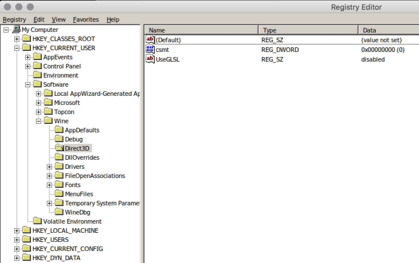 - HKEY_CURRENT_USER -> Software -> Wine -> Direct3D