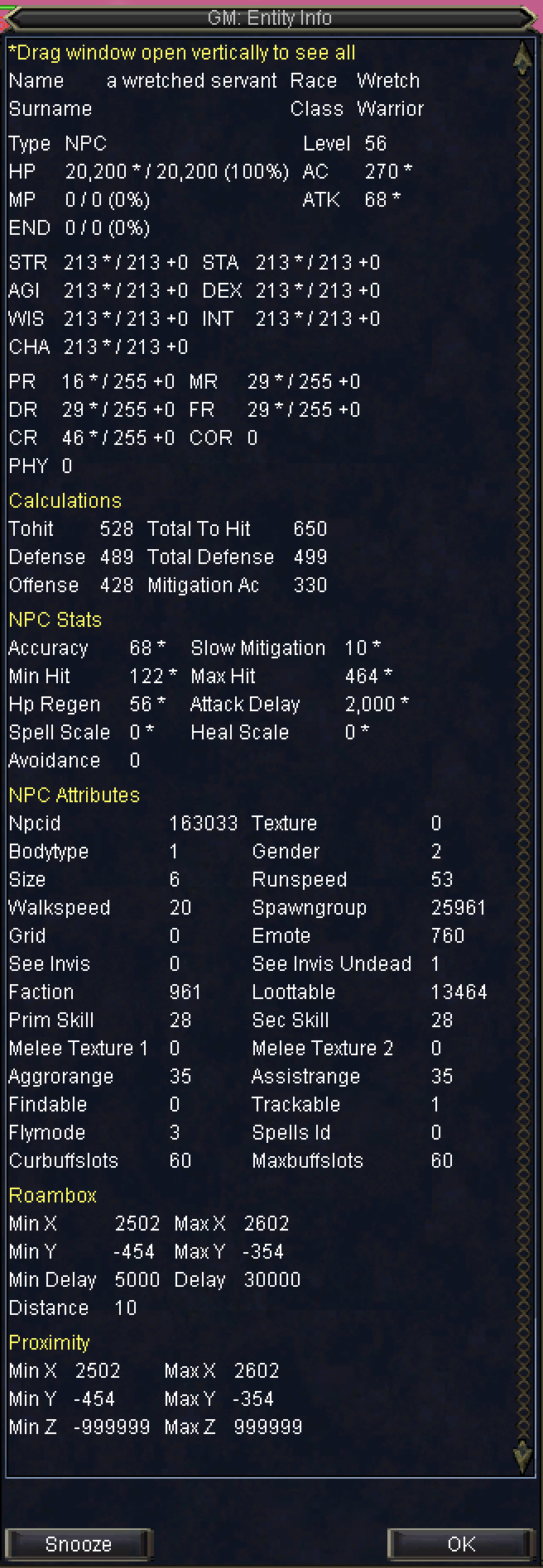 You can also see which attributes are applied to an NPC using the DevTools mob info display window (Targeting an NPC). Any stat that has been loaded from the global scale system has an asterisk next to it