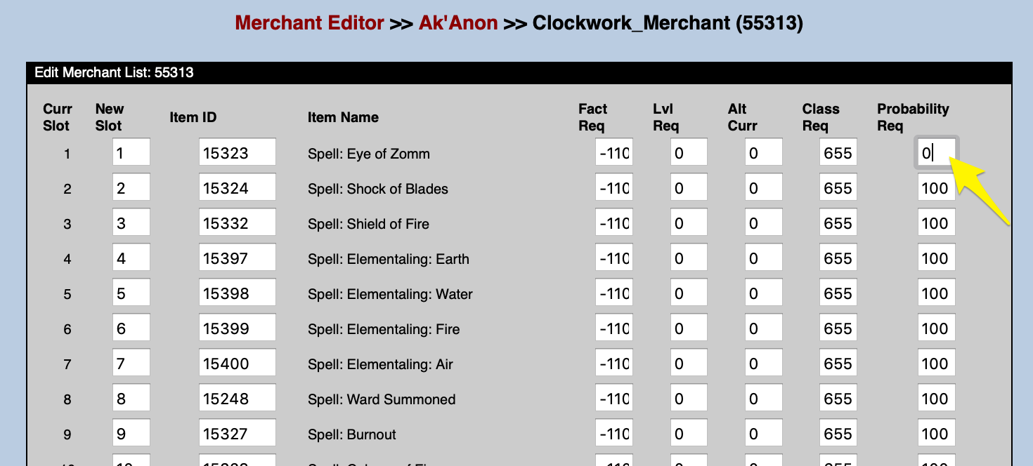 Note the field that shows Probability Req--this is the probability that the merchant will have the item. To Edit this field, select the "Edit this Merchant" button, which looks like a stack of papers: