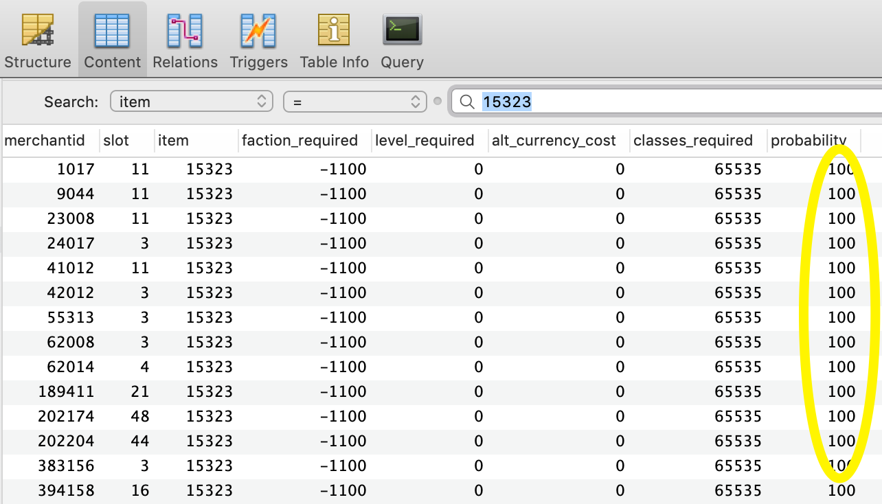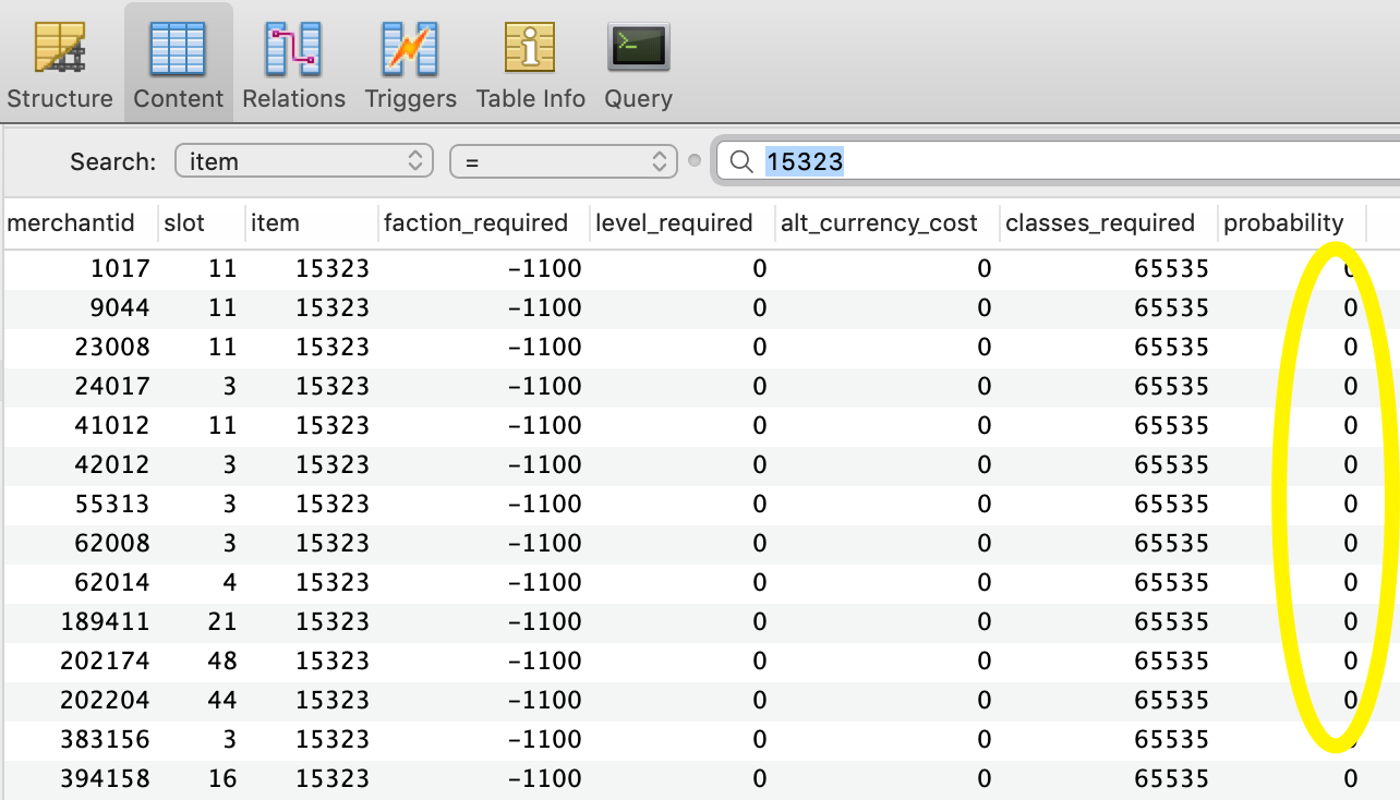 If we want to see how many merchantlist entries contain item ID 15323 - Spell: Eye of Zomm, we can simply filter (query) the merchanlist entries for this item by ID.